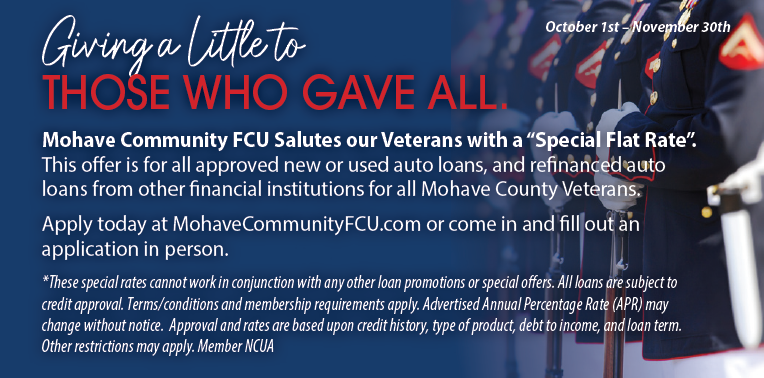 By clicking on this link, you are now leaving the Mohave Community Federal Credit Union’s Website and going to a third party site. That site may have a privacy policy different from MCFCU and may provide less security than this MCFCU site. Mohave Community Federal Credit Union and its affiliates are not responsible for the products, services, and content on the third party website.